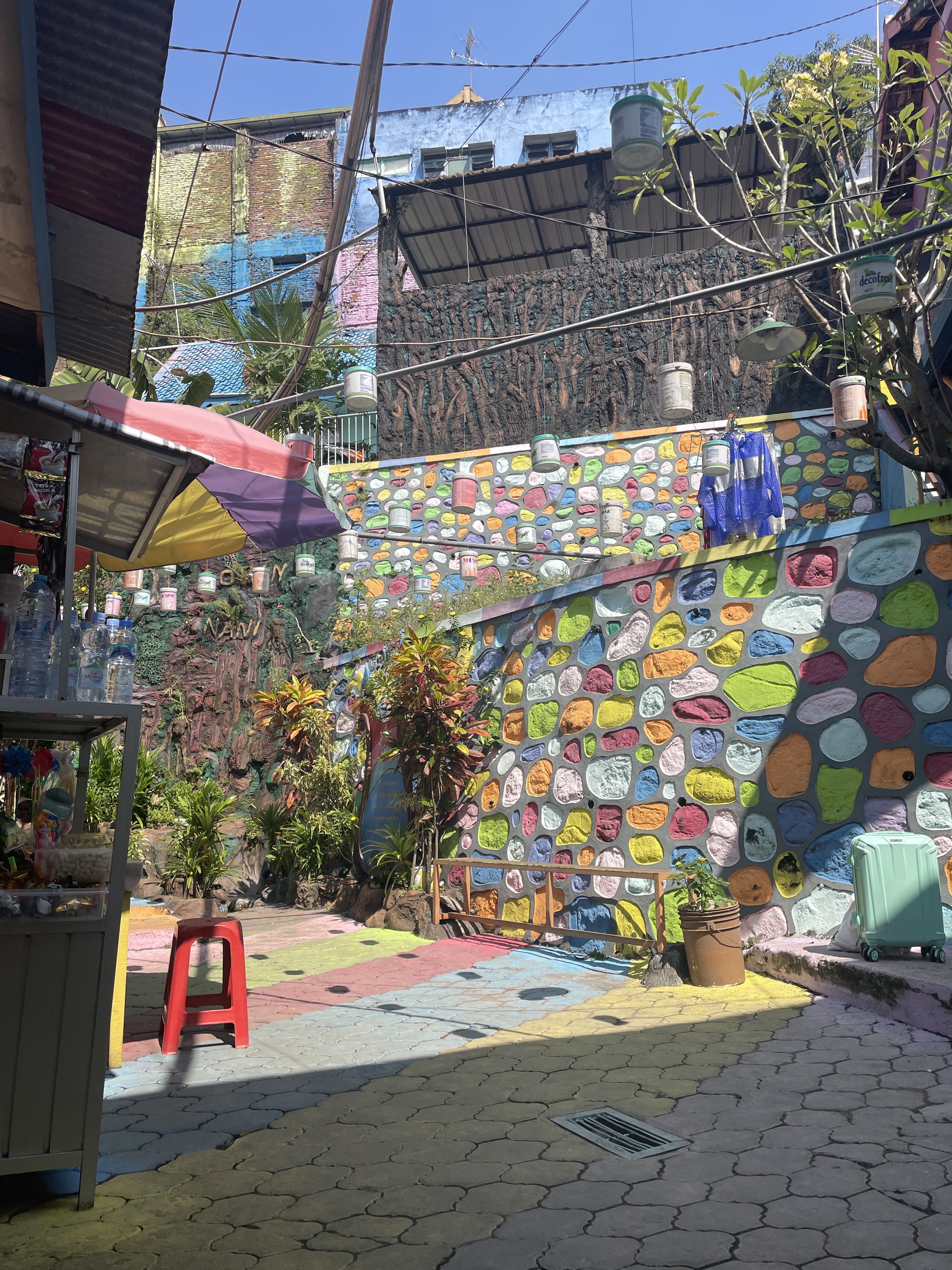 En fait, les quartiers sont des anciens bidonvilles qui ont été peints par des étudiants pour attirer les touristes. Je pense que ça a plutôt marché étant donné que maintenant nous pouvons voir beaucoup de photos des quartiers colorés à Malang.