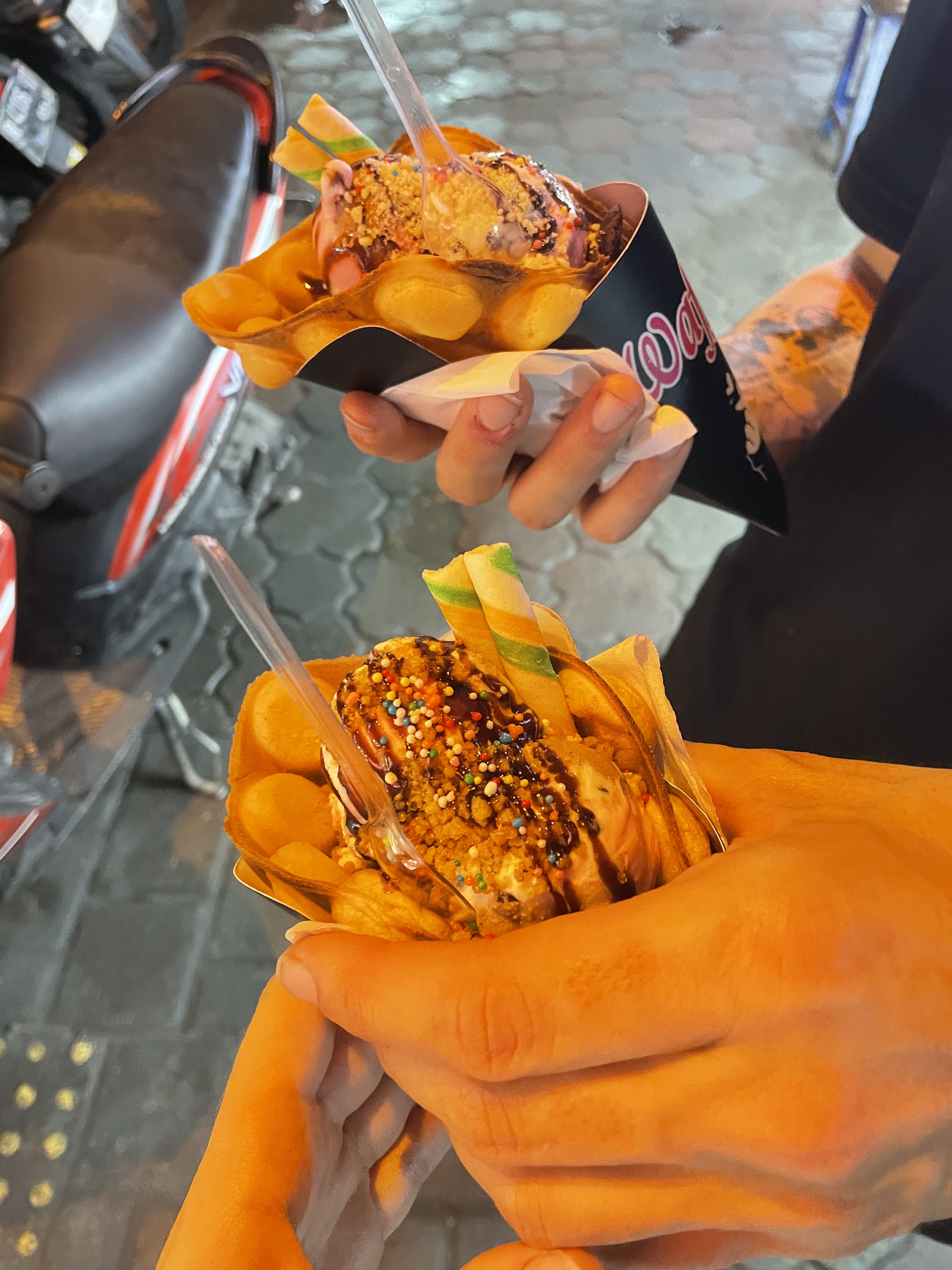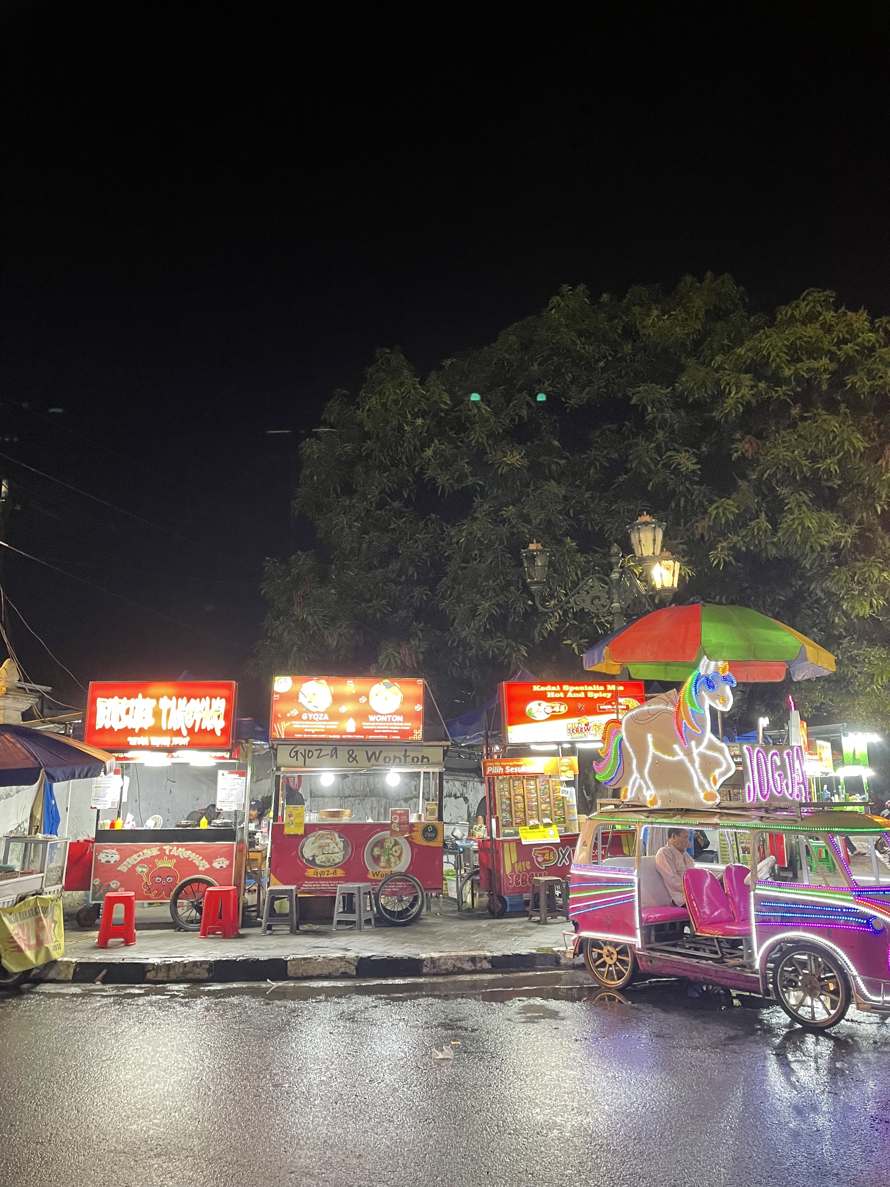 - Alun Alun Market. Il s’agit d’un marché de nuit qui propose énormément de spécialités asiatiques. On vous conseille vivement de vous y rendre pour s’imprégner directement de la nourriture locale. C’est un marché très fréquenté par les locaux. On a pu goûter des dim sum (5K par dim sun), des gyozas (15K pour 5), des wontons (13K pour 4) & des takoyaki (25K pour 6 mozzarella & 15K pour ceux aux poulpes). Nous avons fini par une gaufre avec de la glace à l’intérieur et d’autres sucreries en tout genre.