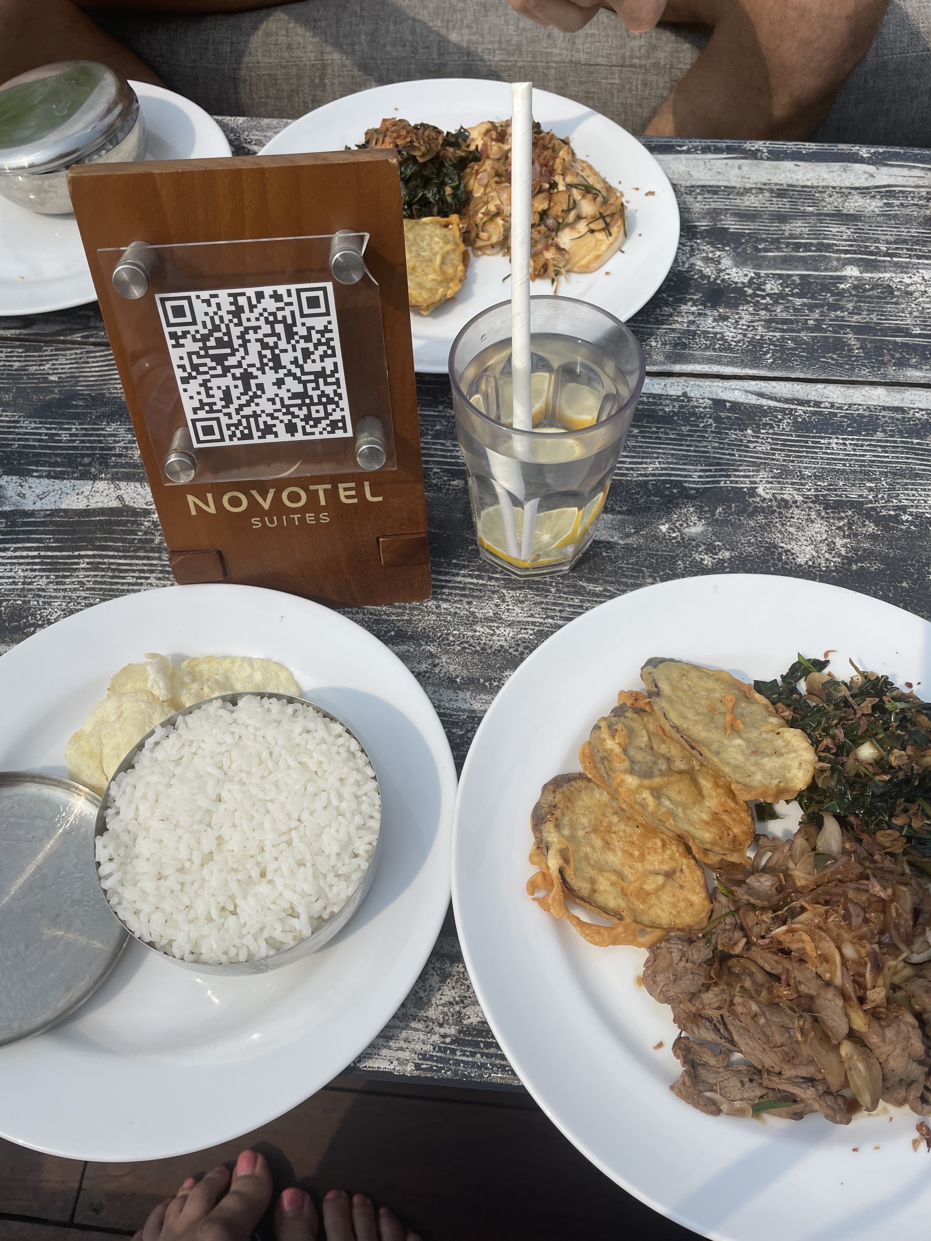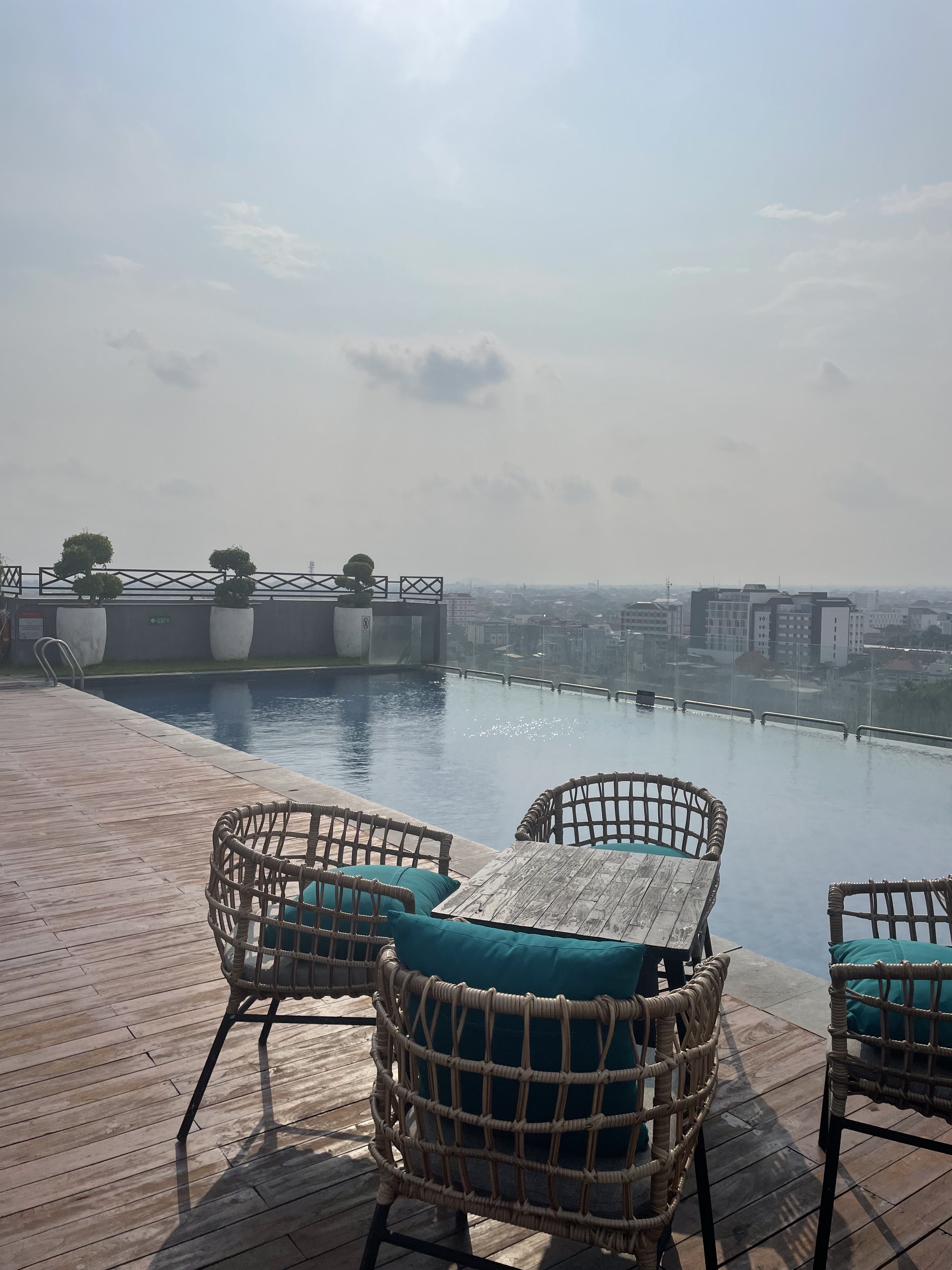 Puis, nous voulions nous reposer un petit peu. Nous avons donc décidé d’aller manger et chiller au Pool bar de l’hôtel Novotel. Il s’agit d’un rooftop avec une piscine accessible gratuitement. J’imagine qu’il est préférable de consommer sur place. C’est pourquoi nous avons décidé de déjeuner là-bas. Les prix sont bien sûr beaucoup plus chers qu’en ville (ce qu’on ne savait pas, c’est que cela allait être notre repas le plus cher de tout notre voyage en Indonésie). Nous en avons eu pour 12 € les 2 plats et 2 boissons. A ce moment-là, nous étions super contents de pouvoir profiter d’une jolie piscine rooftop avec cette chaleur et il fallait qu’on se remette une bonne fois pour toute du décalage horaire !