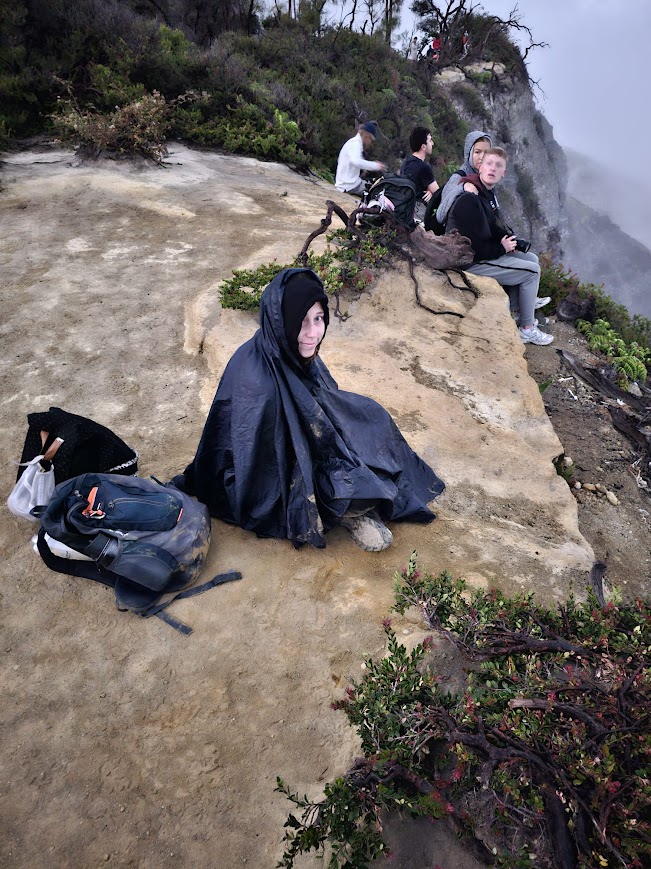 Après un peu de marche en haut du cratère, nous trouvons un petit spot sympathique où s’asseoir. Malheureusement pour nous, le temps ce jour-là était hyper nuageux et j’ai eu très très froid. Entre la fatigue, le fait de se lever tôt et qu’on se soit pris la pluie sur la route, c’était un peu rude de mon côté. En plus, il n’y avait pas de soleil pour me réchauffer..