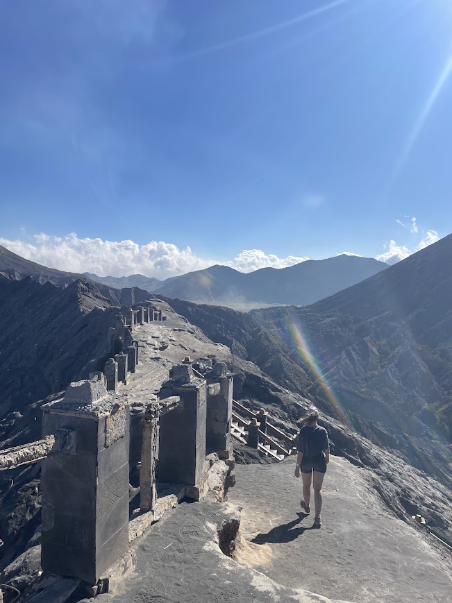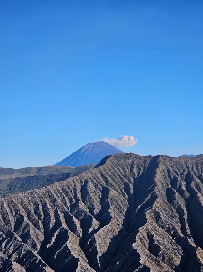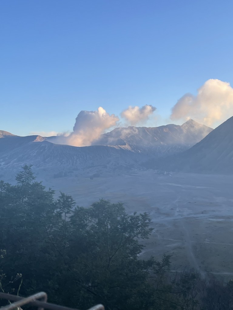 Par contre, une fois arrivés en haut, le spectacle est époustouflant. Nous sommes seuls au monde, avec une vue à 360° sur toutes les montagnes et volcans environnants, dont le Semeru qui fume. Le cratère du Mont Bromo est lui aussi visible. C’est un spectacle incroyable qui se pose devant nos yeux, avec une lumière magnifique, alors si vous vous sentez un petit peu aventuriers, n’hésitez pas à monter cet ancien volcan, c’était vraiment spectaculaire. En plus, meilleure récompense, nous étions littéralement seuls.