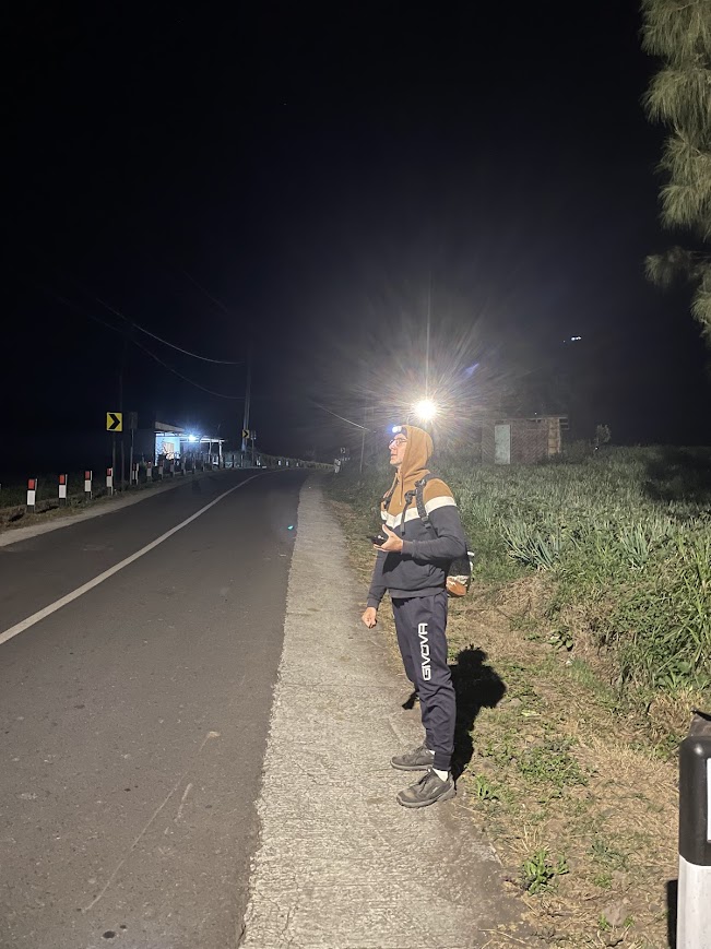 Départ à 2h45 depuis notre hébergement pour le King Kong Hill, le fameux sommet d’où observer le lever du soleil sur le Mont Bromo. Pour être parmi les premiers en haut, nous commençons la randonnée un quart d’heure plus tôt que l’heure indiquée dans d’autres blogs. Le chemin est disponible sur Google Maps et Maps.me. La première partie de la randonnée se fait le long de la route principale. Nous croisons pas mal de chevaux et quelques Jeeps qui montent comme nous. Heureusement, à 2h45, il n’y a pas encore beaucoup d’activité, donc aucun problème pour monter à pied. Après une trentaine de minutes, nous arrivons devant une barrière où tous les Jeeps doivent s’arrêter, et nous pouvons continuer à pied.