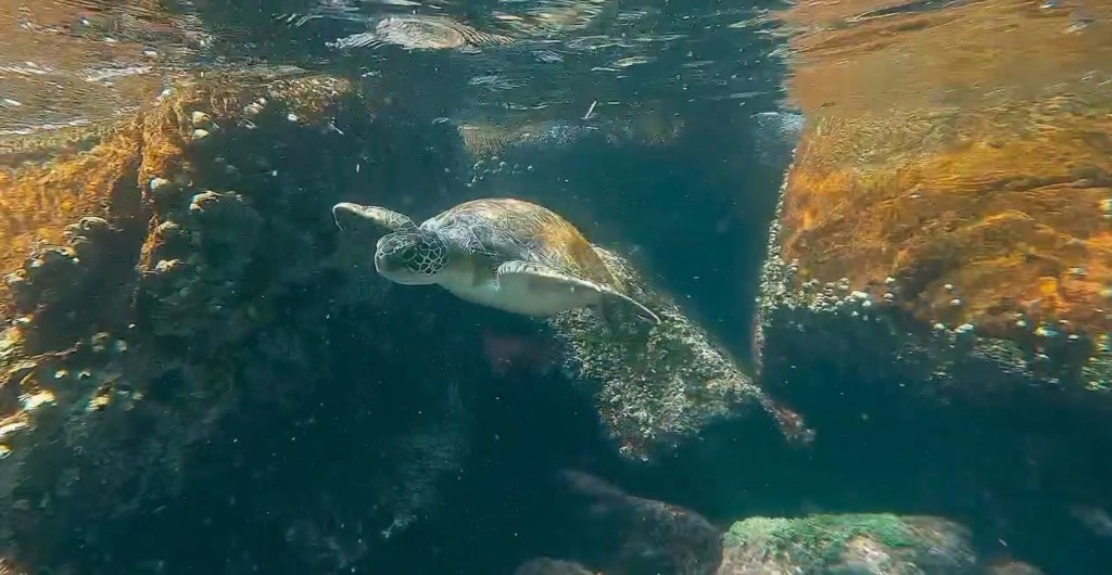 Un peu plus loin, nous nous arrêtons dans une lagune, à Praia da Piedade, surprise, nous apercevons une tortue !