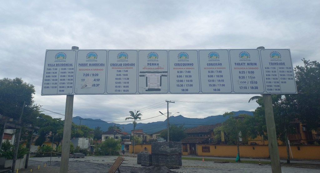 Le matin, vers 9h30, on a pris un van/bus depuis la gare routière, direction Paraty Mirim, le terminus. Les horaires sont affichés sur place, ce qui est pratique.