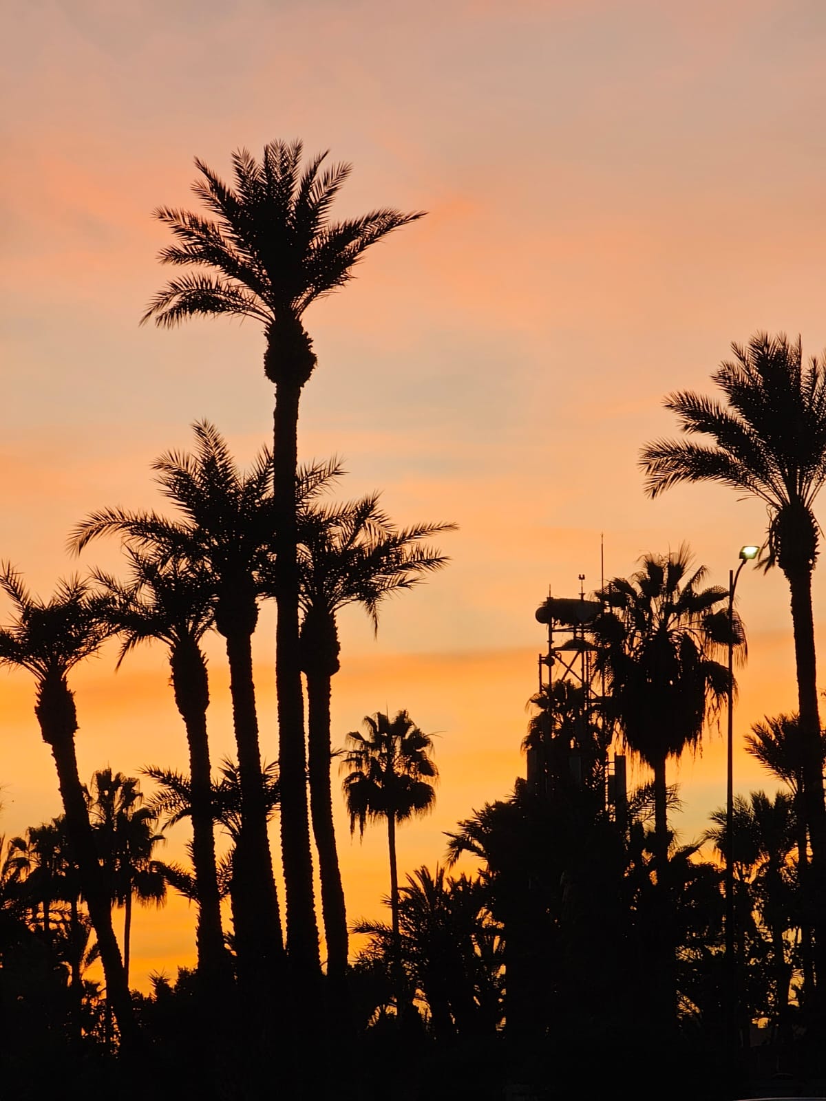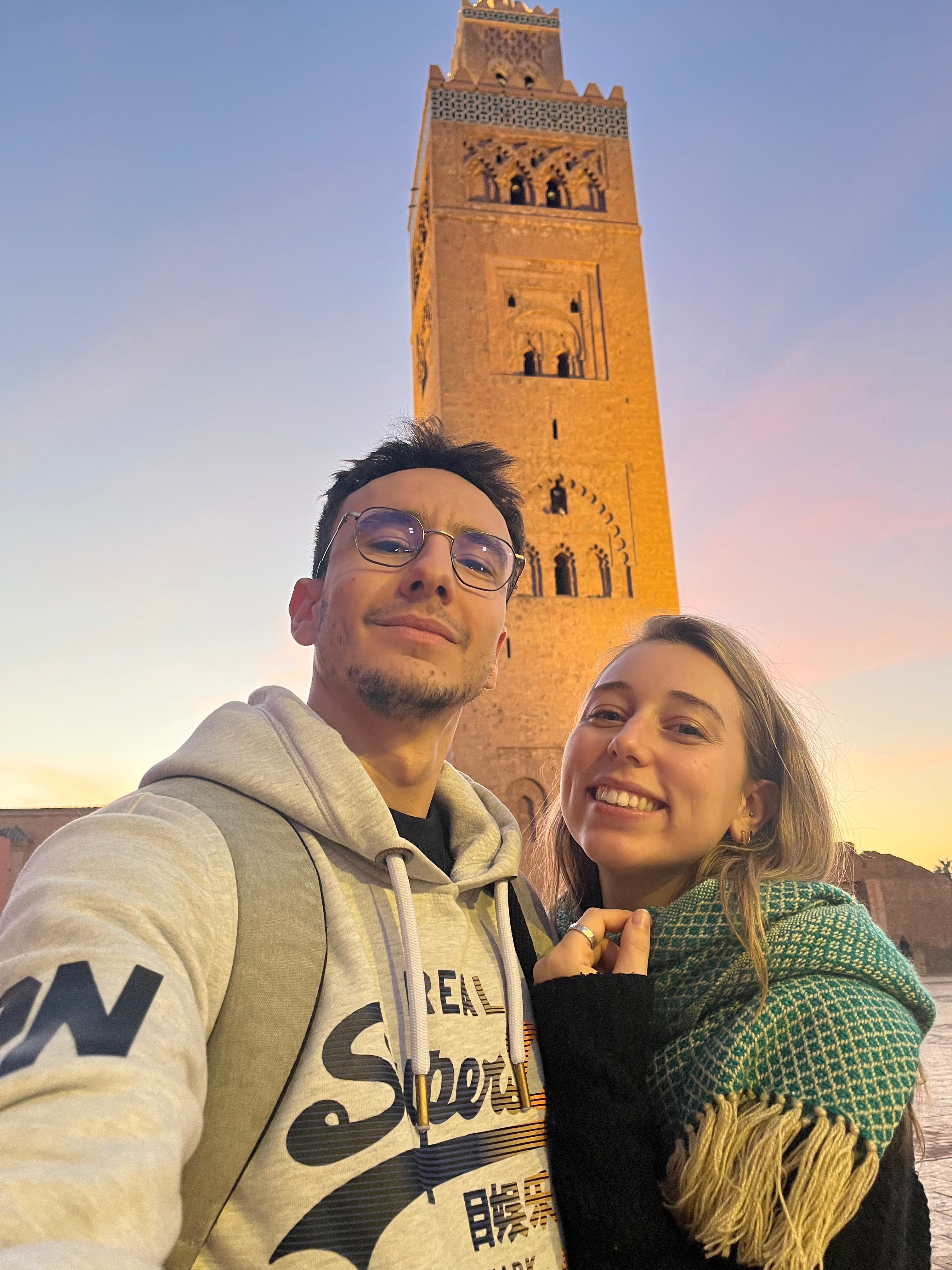Pour finir la soirĂ©e en beautĂ©, on a admirĂ© le coucher de soleil depuis la mosquĂ©e de la Koutoubia đ â un spot bien plus calme et vraiment beau.