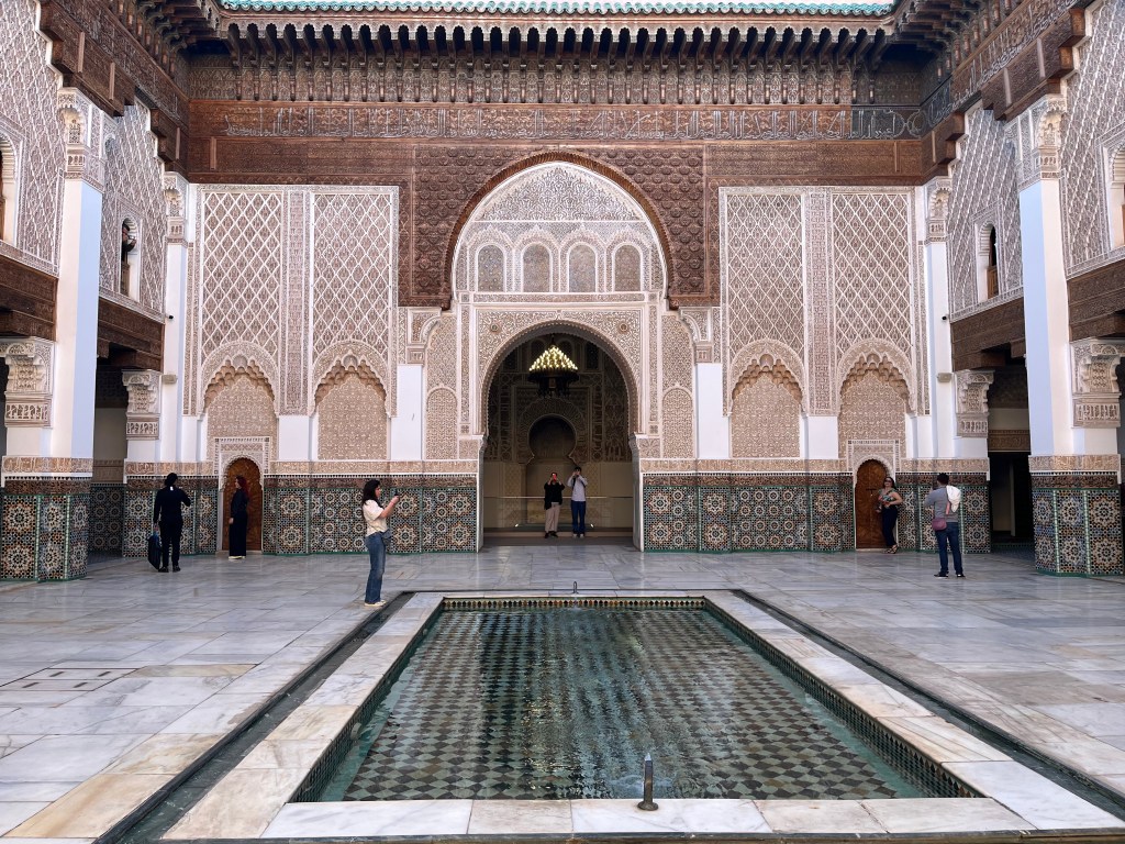 La Medersa Ben Youssef (que nous avons visitĂ© le lendemain matin). La mĂ©dersa Ben Youssef a Ă©tĂ© fondĂ©e au 14e siĂšcle, puis entiĂšrement reconstruite au 16e siĂšcle par les Saadiens (encore euxâŻ!). Elle a accueilli jusquâĂ 900 Ă©tudiants venus de tout le monde musulman. Câest lâun des plus beaux exemples dâart arabo-andalou de tout le Maghreb. Elle a rouvert en 2022 aprĂšs plusieurs annĂ©es de restauration â elle est plus belle que jamais ! Tarif : 50 dirhams. Ouverte tous les jours, en gĂ©nĂ©ral de 9h Ă 18h.