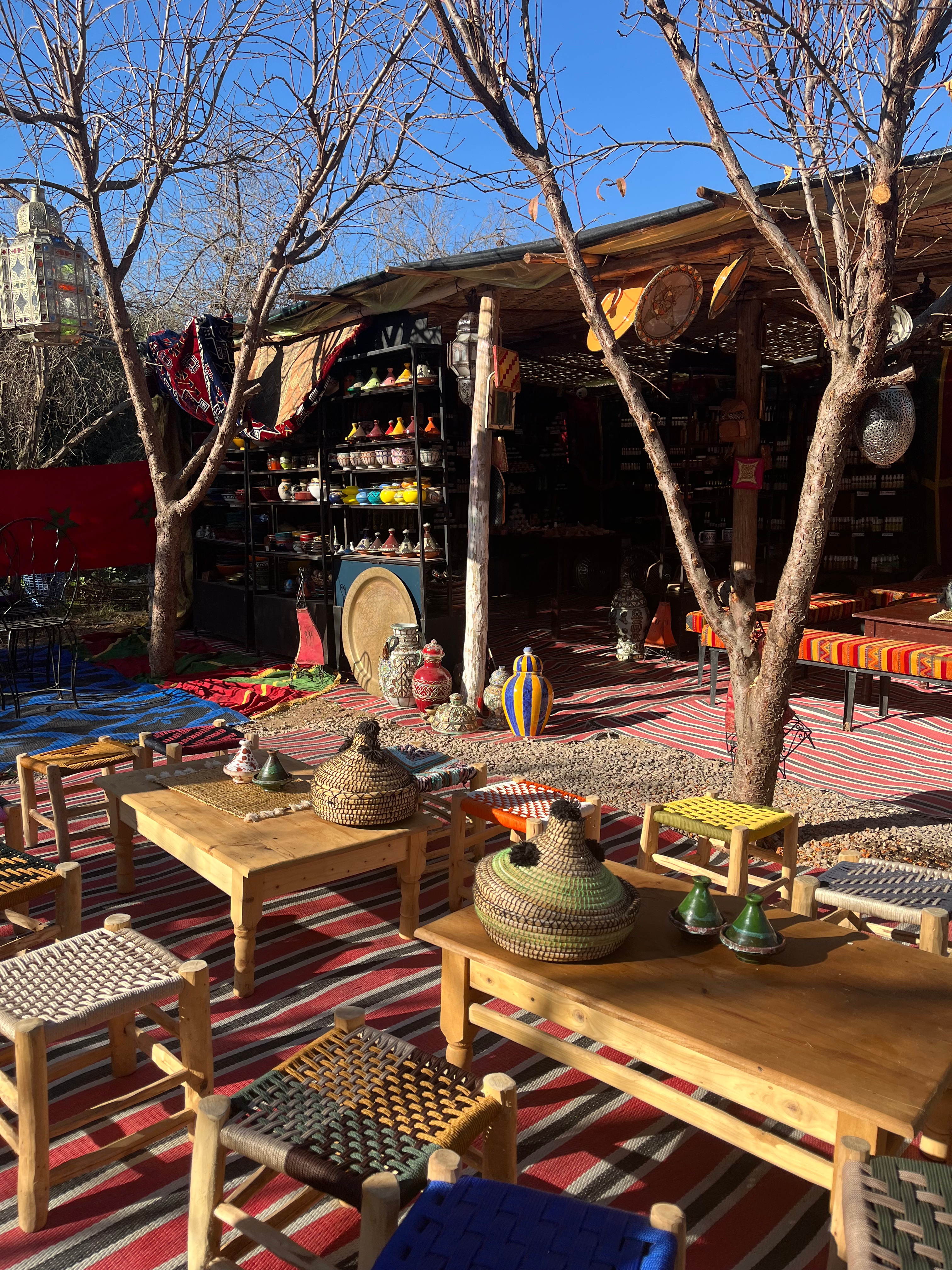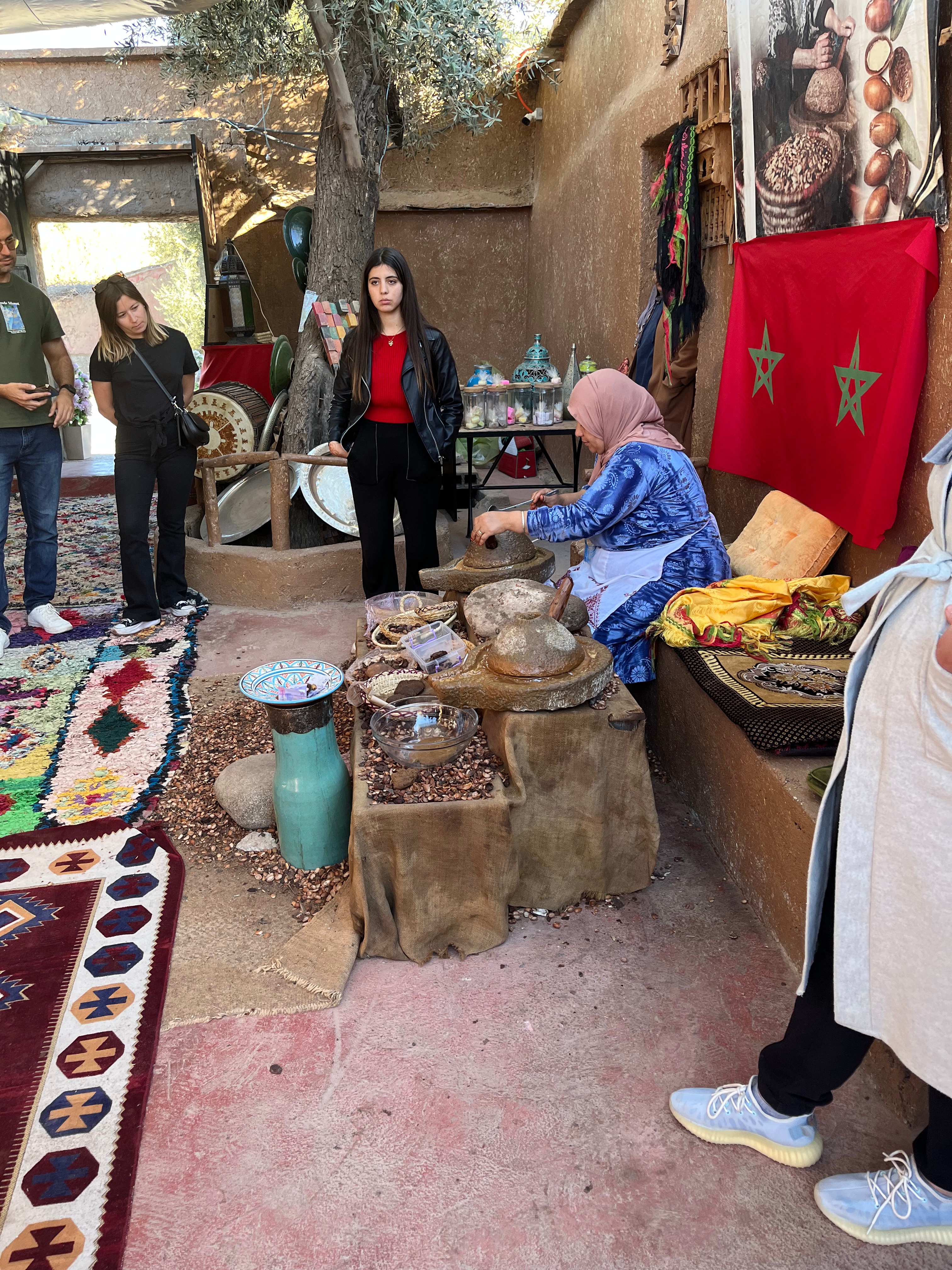 PremiĂšre Ă©tape : une fabrique dâhuile dâargan. Oui, un arrĂȘt typique pour acheter des souvenirs, mais câĂ©tait aussi intĂ©ressant, surtout quâon a eu droit Ă un thĂ© đ” et un petit goĂ»ter.