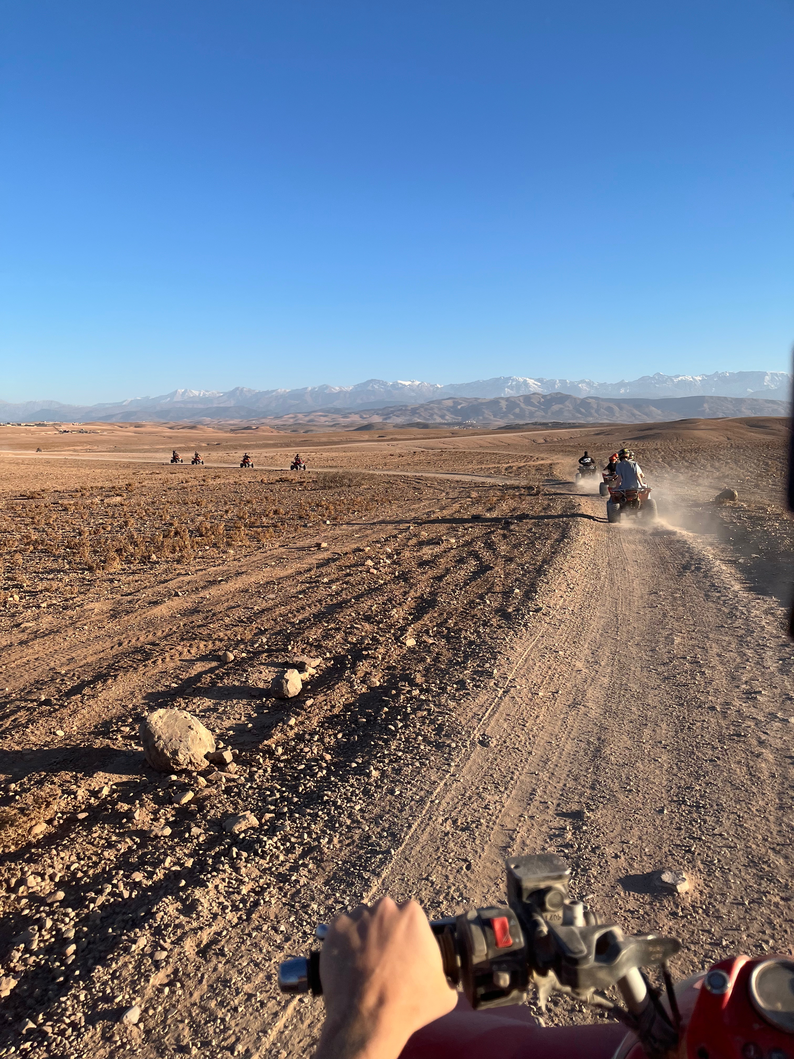 Ensuite, direction le dĂ©sert ! On prend un petit thĂ© sur place en attendant, puis câest parti pour une balade en quad đïž en duo dâune heure.. Le paysage avec la lumiĂšre du coucher de soleil Ă©tait sublime. Ăvidemment, en une heure on ne fait pas tout le dĂ©sert, mais câĂ©tait top. Les guides ont mĂȘme fait deux groupes selon le niveau de chacun en quad, ce qui nous a permis dâaller un peu plus vite âĄ