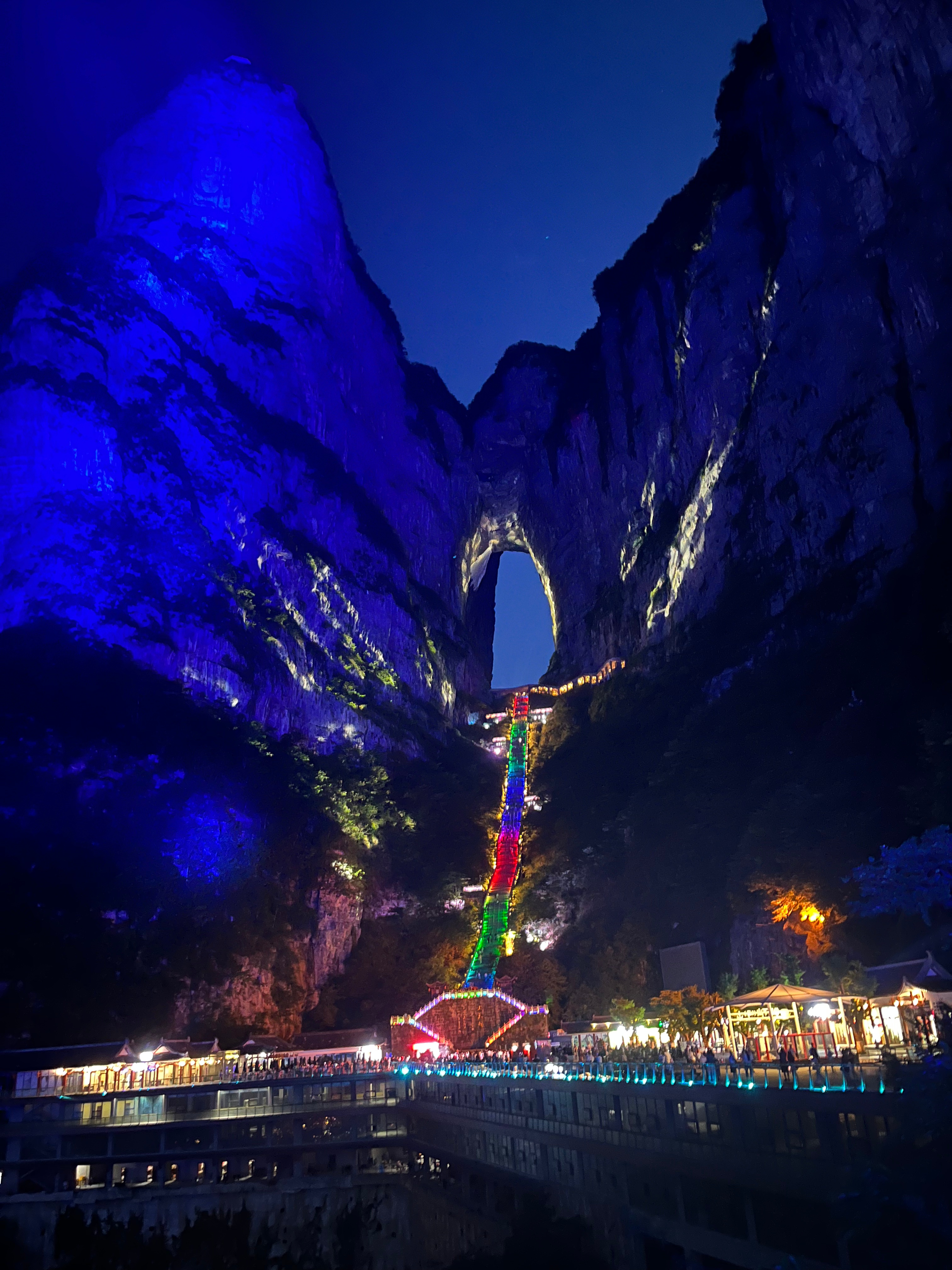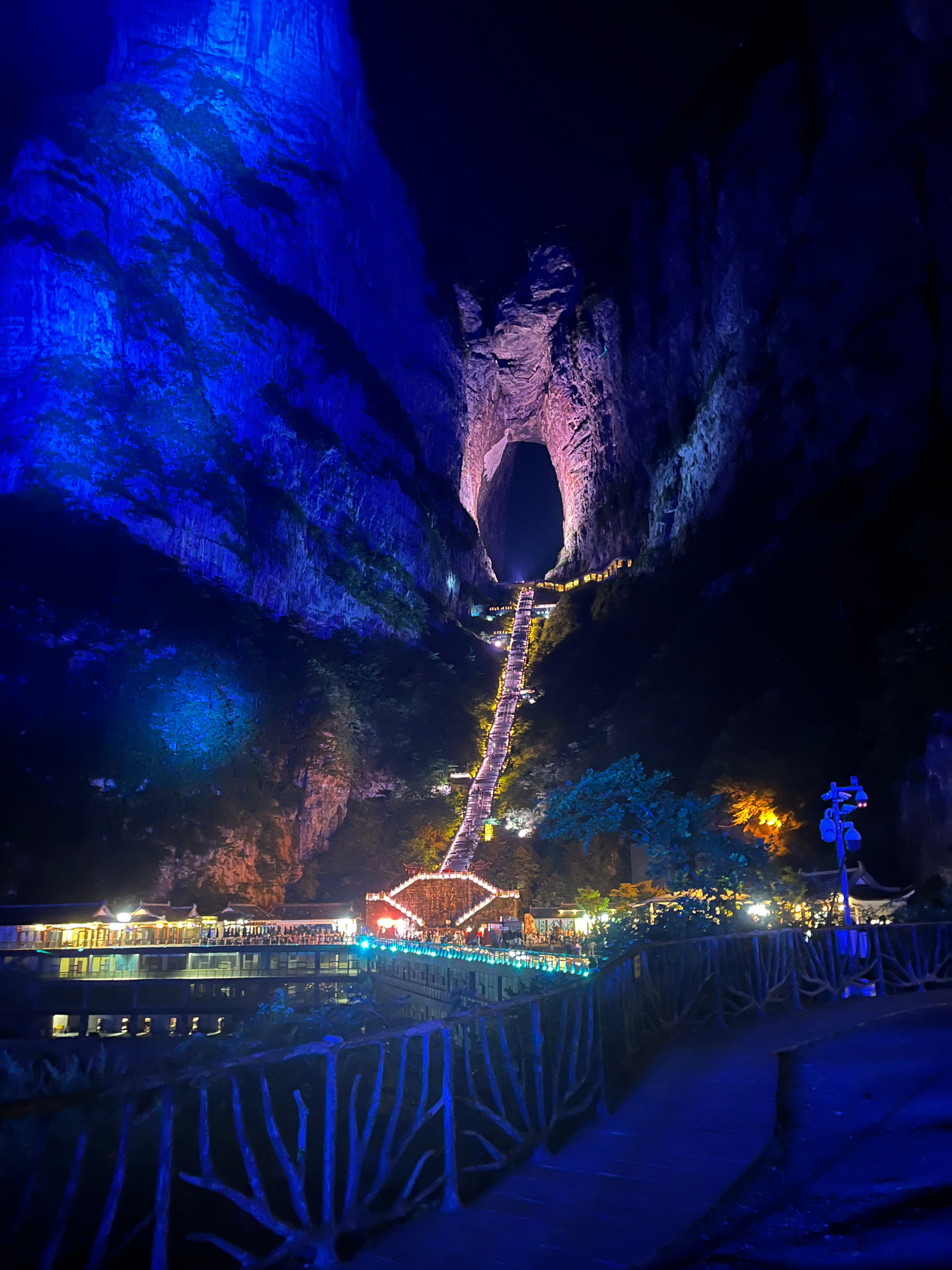 A la tombée de la nuit, chaque soir, il y a un spectacle de lumière sur la porte du ciel. Nous sommes donc restés jusqu’au coucher du soleil pour profiter de ce show. très honnêtement, nous n’avons pas trouvé ça incroyable. Les escaliers s’allumaient de différentes couleurs et il y a avait quelques projections de couleurs sur la paroi mais c’est tout..