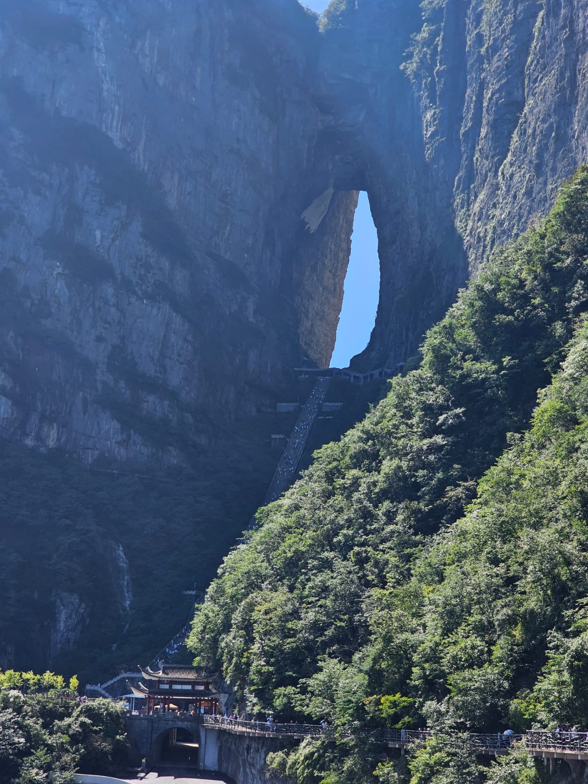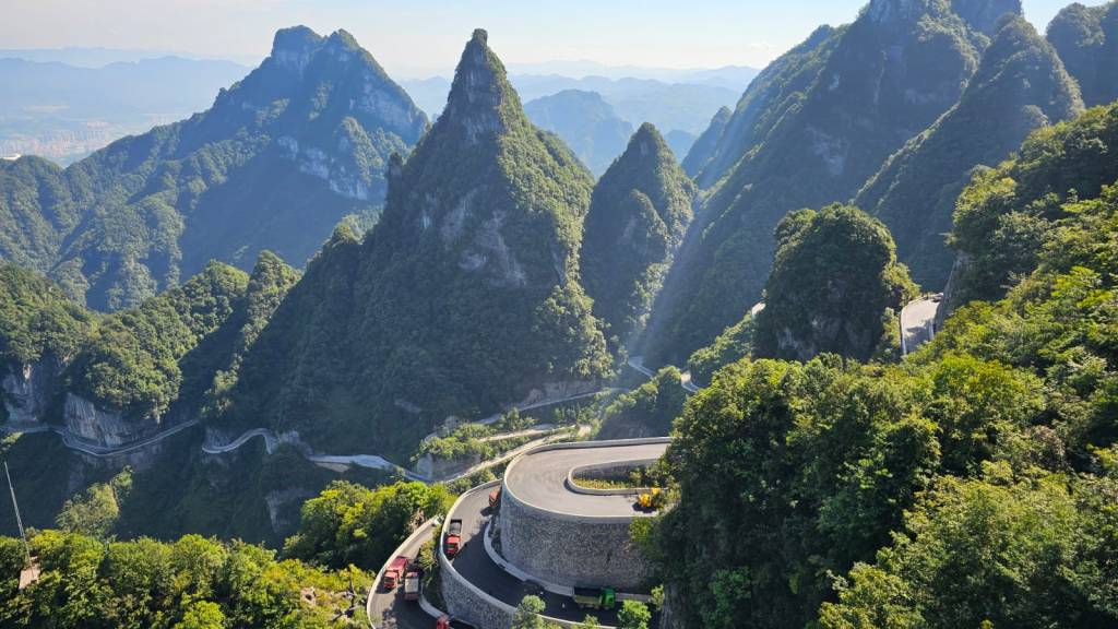 Tianmen Mountain est également connu pour sa route sinueuse aux 99 virages mais en août 2025 cette route était en travaux. A la place, il y a avait une navette et un petit téléphérique qui montait à l’entrée du parc.